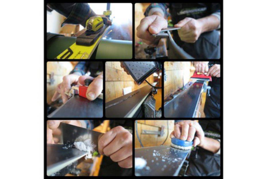 Lorsque vous passez sur des cailloux, des trous et rayures se forment sur la semelle de vos skis ou de votre snowboard. Nous faisons fondre un plastique spécial pour reboucher les trous de la semelle. Ensuite nous égalisons la semelle à l’aide d'une machine spécifique. Cette étape est appelée le PONÇAGE.